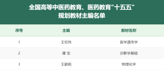 近日,全国高等中医药、医药教育“十五五”规划教材主编人选名单公布,我校王宏伟、谭宝、王颖莉三位教授获聘《医学遗传学》《诊断学基础》《物理化学》教材主编。我校19位教师获聘“十五五”规划教材副主编。